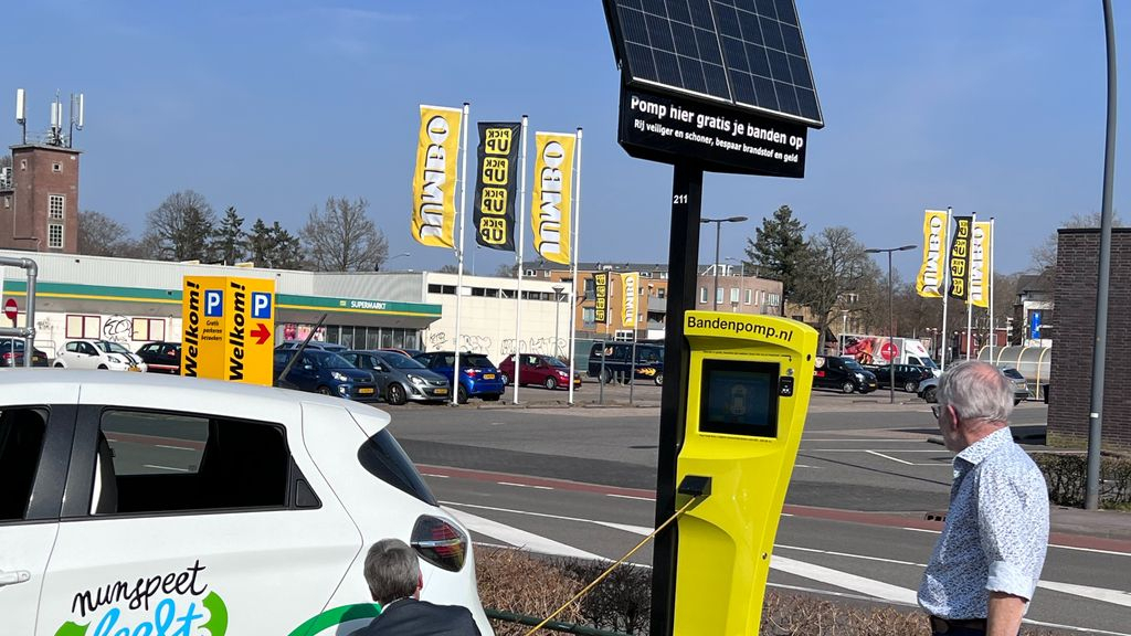 NUNSPEET - Wethouder Jaap Groothuis heeft dinsdag de slimme bandenpomp van 'Band op Spanning' in gebruik genomen. Deze pomp weet precies wat de optimale bandenspanning van een auto is, zodat er maximaal brandstof bespaard kan worden. De pomp staat aan de Industrieweg 10a, op het parkeerterrein van de Welkoop en is door iedereen kosteloos te gebruiken.