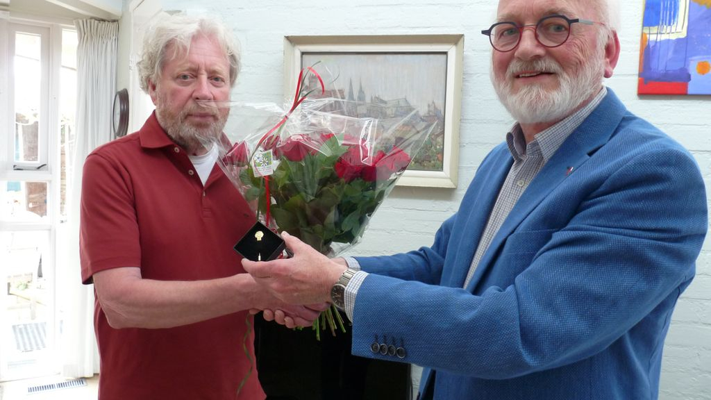 In Nijkerk kreeg Patrick Kielestein de jubilarisspeld uitgereikt voor zijn 25-jarig lidmaatschap van de partij. Beide jubilarissen waren blij verrast en kregen bij de speld ook een fraaie bos rozen overhandigd.