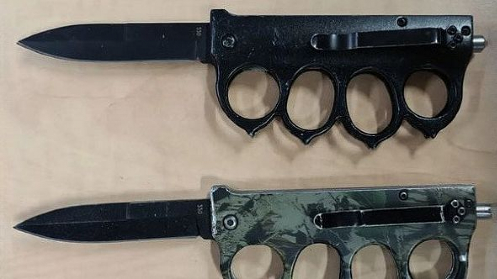 De verdachte had twee boksbeugelmessen bij zich. Met dat verboden wapen kan je niet alleen een flinke klap uitdelen, maar ook steken of snijden. 'Er is geen enkele goede verklaring dat je dit bij je draagt', schrijft de politie Ermelo op Instagram.