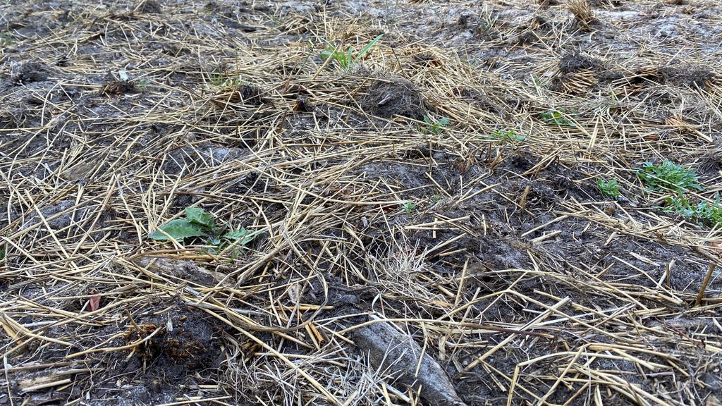 Het stukje bewerkte grond ziet er nog grotendeels identiek uit als twee maanden geleden. "We hebben bloemen ingezaaid", zegt een vertegenwoordiger van de boeren. "Maar die komen niet op. De grond is bijna dood. Er zit geen bodemleven in."