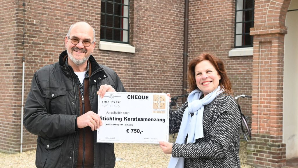 HOEVELAKEN - Bij de dorpskerk in Hoevelaken is vrijdagmiddag 6 januari een cheque overhandigd aan Wil van Kooij en Gert van der Top van de stichting Together One Family ter waarde van 750 euro. Dat geld is enkele weken geleden opgehaald tijdens de collecte van de kerstsamenzang waar Wil van Kooij het gezelschap toesprak over het werk van de stichting.
