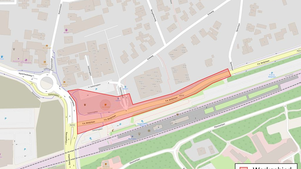 NUNSPEET - Vandaag is de BAM begonnen met de voorbereidingen voor het verleggen van de F.A. Molijnlaan. Om deze werkzaamheden veilig te kunnen uitvoeren, is de weg tijdelijk afgesloten vanaf de Spoorlaan. Voordat de rijbaan daadwerkelijk verlegd kan worden, moeten nieuwe kabels en leidingen en een nieuw rioolstelsel aangebracht worden. Nadat de riolering is aangelegd en de weg naar het noorden is verlegd, wordt er een nieuwe laag asfalt aangebracht.
