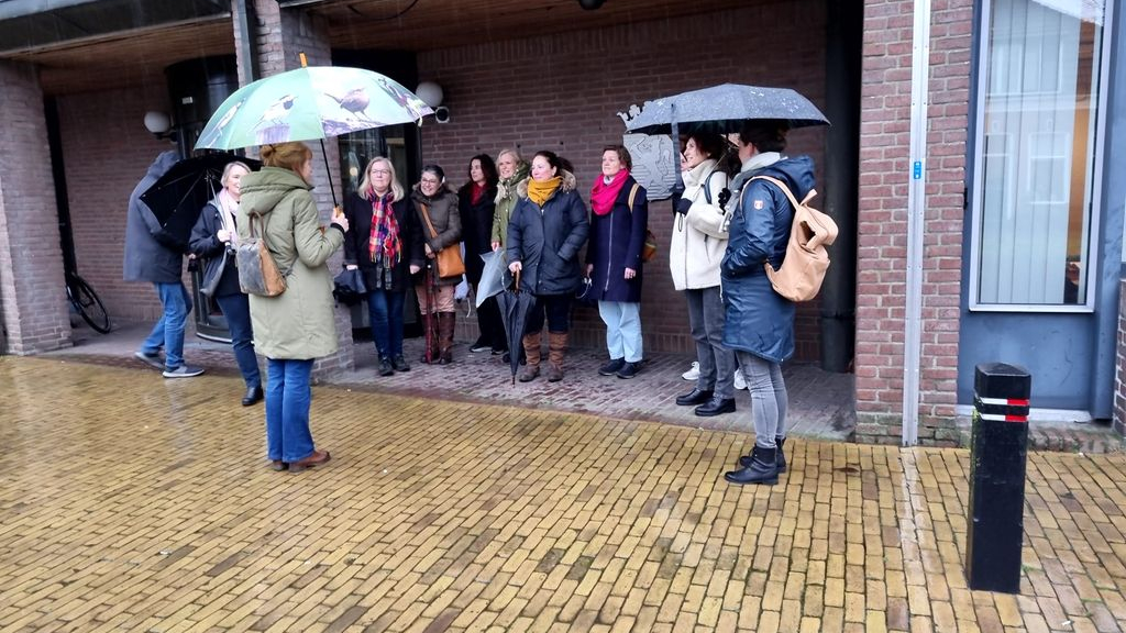 NIJKERK - Het ERErondje is een wandeling van ongeveer 3 kilometer en komt langs 11 plekken van bijzondere Nijkerkse vrouwen. Vanochtend 10 maart startte het rondje bij het monumentale pand van de gemeente Nijkerk, de ingang van de huidige trouwzaal. Onder andere wethouder Rohen en Broekman, gewapend met paraplu, liepen het rondje door Nijkerk. Een handje vol vrouwen trotseerden de regen deze ochtend om het bijzondere verhaal van de vrouwen te horen en hen te eren.