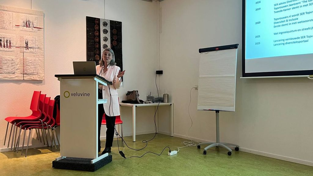 NUNSPEET - Zo’n 30 dames waren maandag aanwezig bij de presentatie van Caroline Holtgreve, directeur van SER Topvrouwen, in de Veluvine over vrouwen met dromen, ambities en lef. Caroline ging in op het belang van een groter aandeel vrouwen in het management en de top van het Nederlandse bedrijfsleven. ‘Met het oog op innovatief vermogen, evenwichtige besluitvorming en zo breed mogelijk afgestelde maatschappelijke antennes, hoort genderdiversiteit in bedrijven bovenaan de boardroomagenda te staan’ zo stelt Caroline.