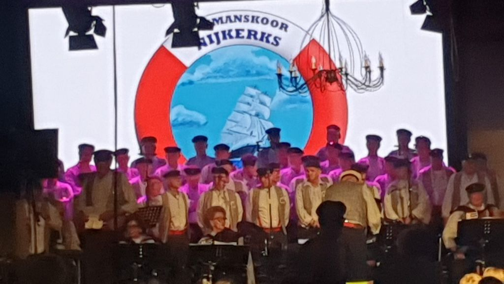 Ook het podium is met zo'n groot koor behoorlijk vol. En komt er een geweld aan geluid de zaal in. En deint het publiek mee van links naar rechts. Of zoals onze fotograaf zegt: "Je wordt er bijna zeeziek van!".