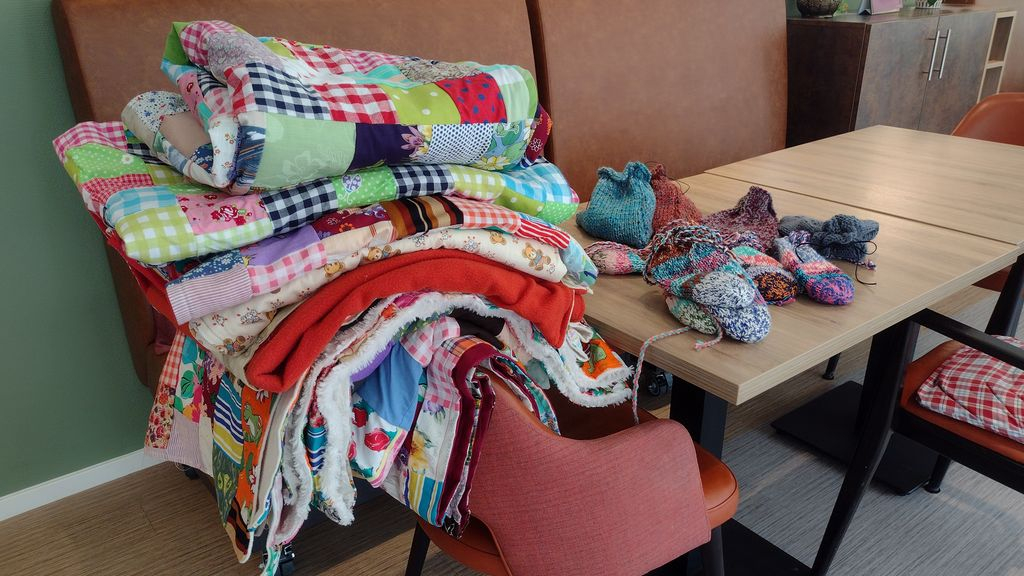 Al sinds een aantal maanden worden er in ieder geval één ochtend in de week lappen geknipt, genaaid en gebreid voor het goede doel. ‘Het is echt teamwork’, legt Ria Bronkhorst van De Veluwse Heuvel uit. ‘Een heel groepje dames zit om de tafel en de bedient de naaimachine, de ander is bezig met knippen en zo worden de dekens samen gemaakt.’ De knikkerzakken werden zelfs ook thuis nog gebreid. Al dat werk leverde een mooi resultaat op om uit te reiken aan Stichting GAiN, namens wie Barta Boonen alle dekens en knikkerzakken in ontvangst kwam nemen.