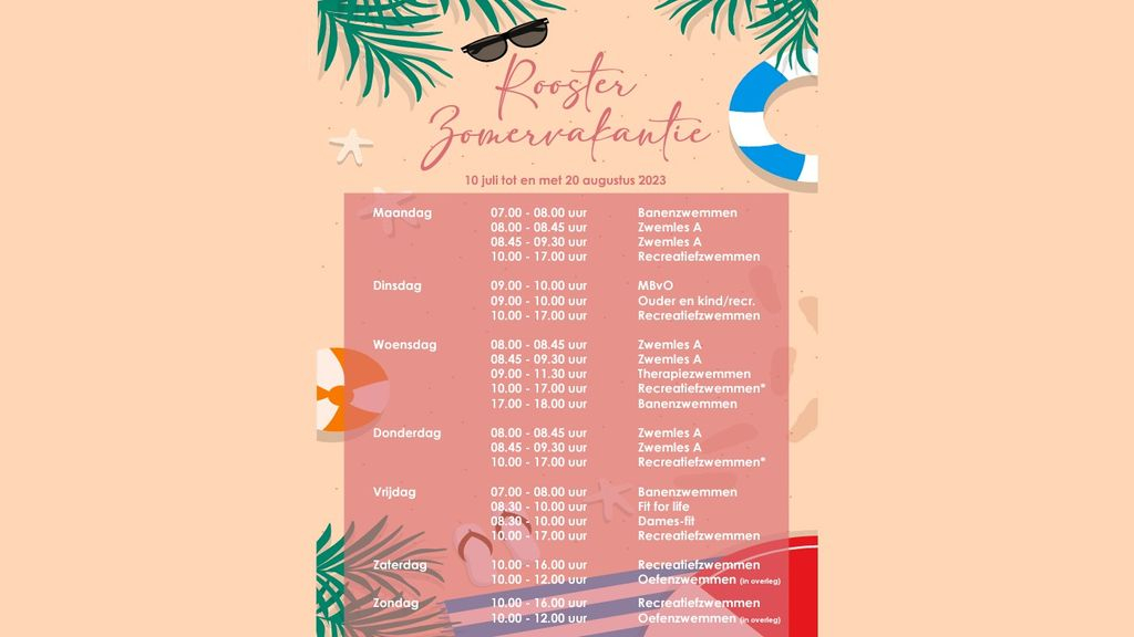 Er is altijd toezicht van een badmeester of badjuf die alles goed in de gaten houdt. Tijdens de zomervakantie kun je door de week iedere dag recreatief zwemmen tussen 10:00 en 17:00 uur en op zaterdag en zondag tussen 10:00 en 16:00 uur.