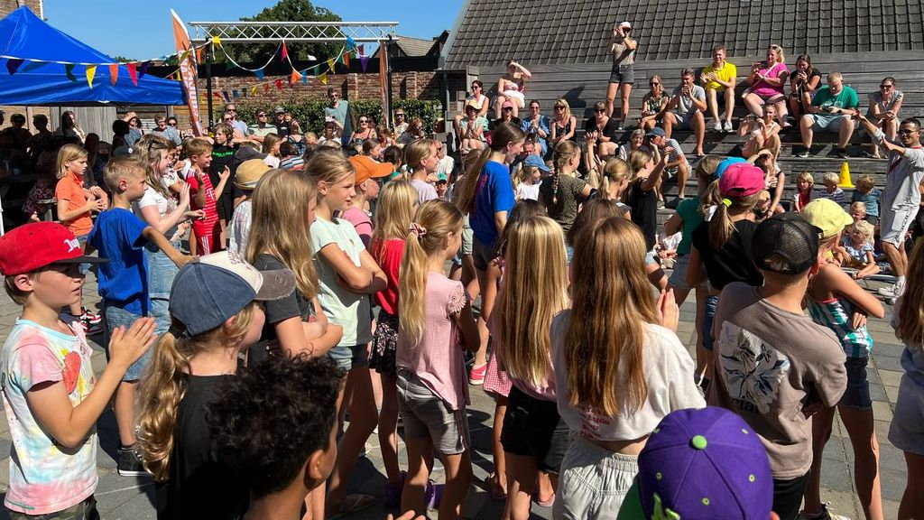 De themadag 'Festival op School' begon in de onderbouwgroepen met de workshops ritmestokjes en dans. De middenbouw kon zich uitleven met slagwerk, rap en stille film en de bovenbouw kon meedoen aan rap, dans en graffiti. De middagviering startte met een rapbijdrage vanuit het team, gevolgd door presentaties van de resultaten van de workshops, die in verband met de warmte helaas wat ingekort moesten worden. Daarna konden de kinderen vrij rondlopen en meedoen aan allerlei activiteiten: schminken, silent disco, free run en diverse springkussen stonden opgesteld, w.o. 'surfen'. In de karaoke caravan werd luidkeels meegezongen en de resultaten van de 'stomme film' konden worden bekeken in het Jenalab.