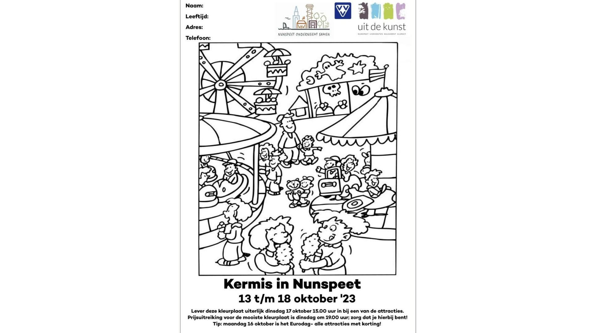 De kermis in Nunspeet staat weer in het dorp vanaf vrijdag 13 oktober tot en met 18 oktober. Tijdens deze dagen worden er dit jaar vele leuke acties en activiteiten georganiseerd. Zo kun je meedoen aan de loterij en de kleurplatenwedstrijd. Lever je kleurplaat in voor dinsdag 17 oktober 15:00 uur bij één van de attracties. Je vindt de kleurplaat