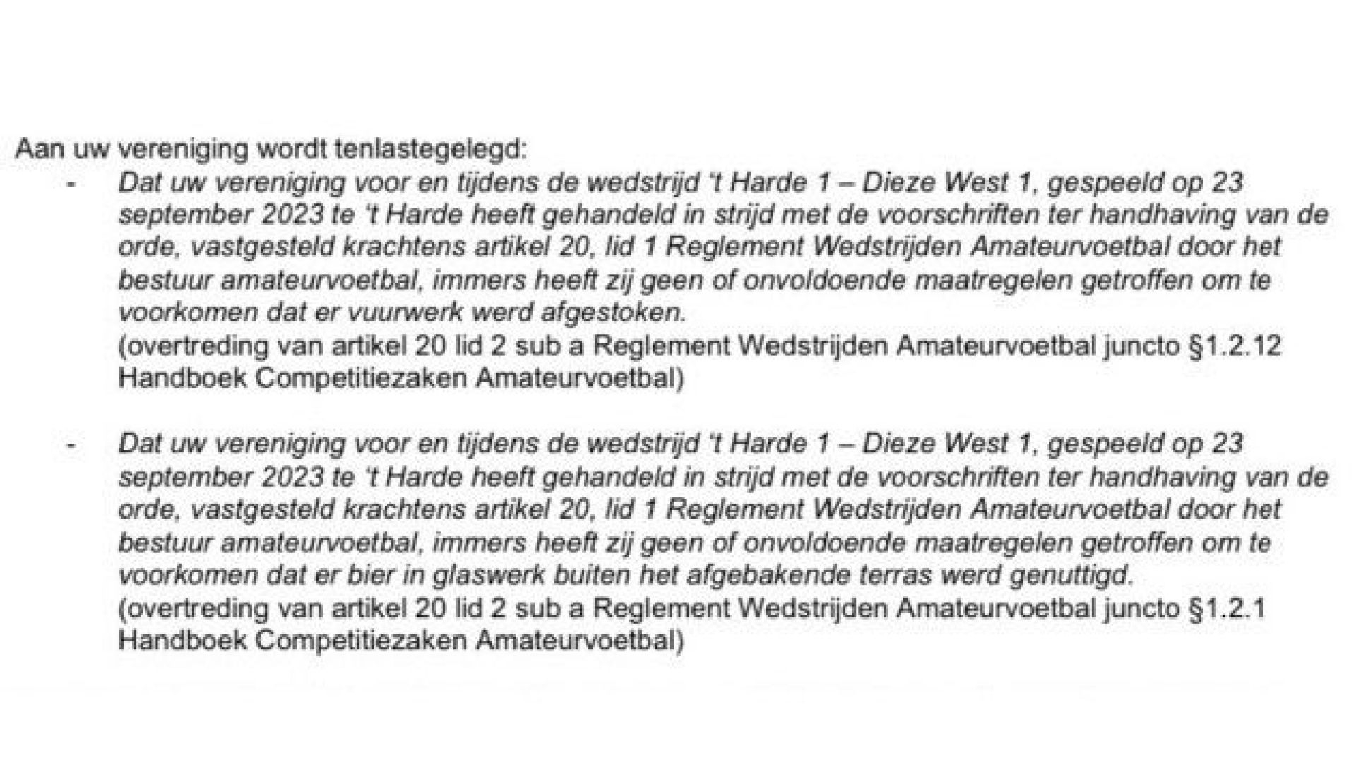 De eerste boetes zijn binnengekomen bij S.V. 't Harde; in totaal voor een bedrag van € 575,00, waarvan € 250,00 voorwaardelijk. Dit omdat er geen of te weinig maatregelen zijn genomen om te voorkomen dat er vuurwerk wordt afgestoken. Daarnaast hebben zij nog een boete gekregen voor het gebruik van alcohol in glaswerk langs de lijnen. De club waarschuwt al jaren dat dit niet mag, er is een prachtig terras maar er zijn toch altijd mensen die de alcohol meenemen van het terras af.