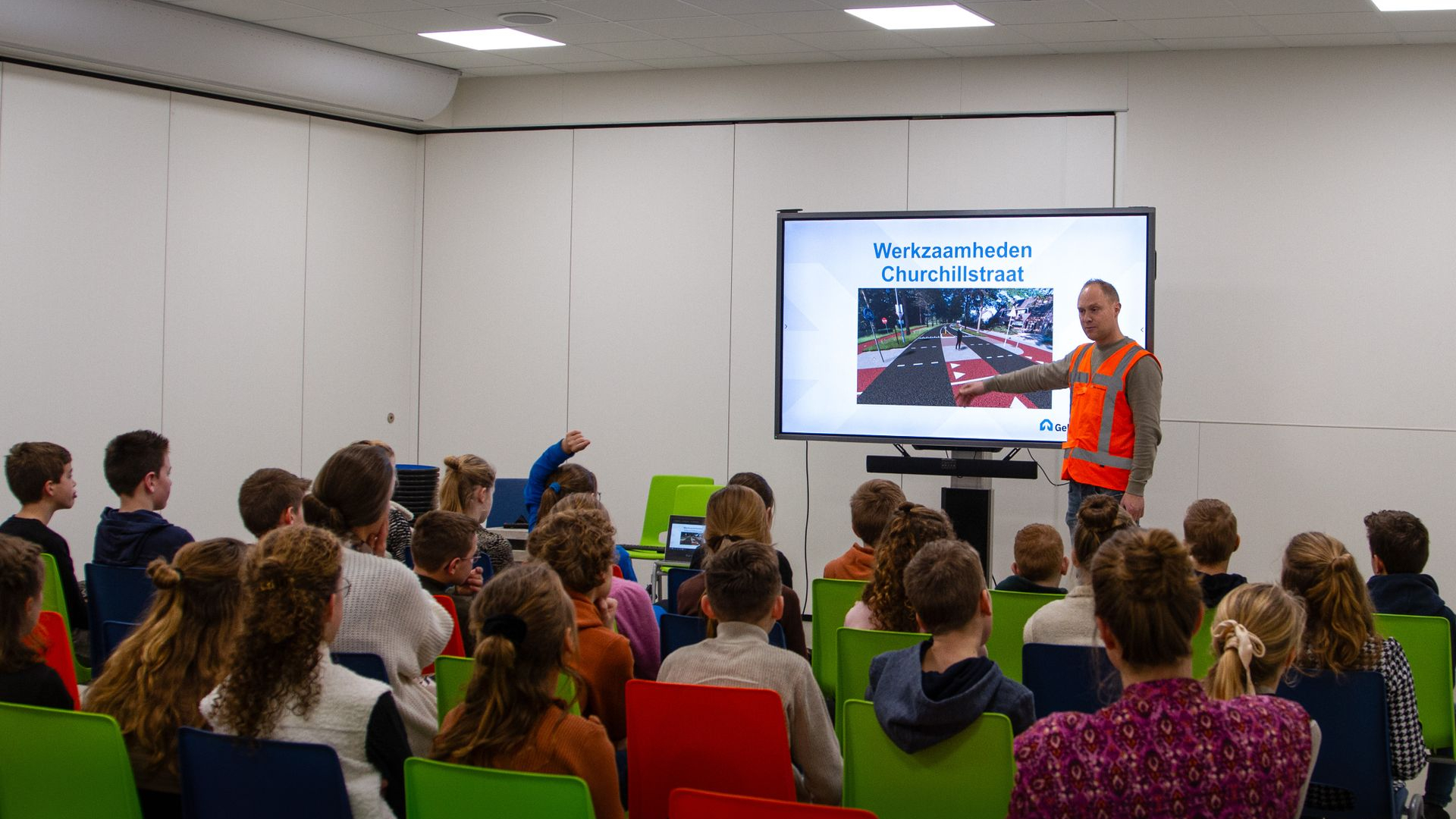 Voordat de leerlingen naar het werk toegingen, kregen zij een gastles die werd gegeven door de projectleider van Gebr. Van Kessel. Zij leerden niet alleen wat asfalt is en hoe het gemaakt en aangebracht wordt, maar ook specifiek over de verduurzamende maatregelen die genomen worden in dit project zoals de waterbergende fundering onder het wegdek, het afkoppelen van hemelwater en het ‘ploffen’ van bomen.