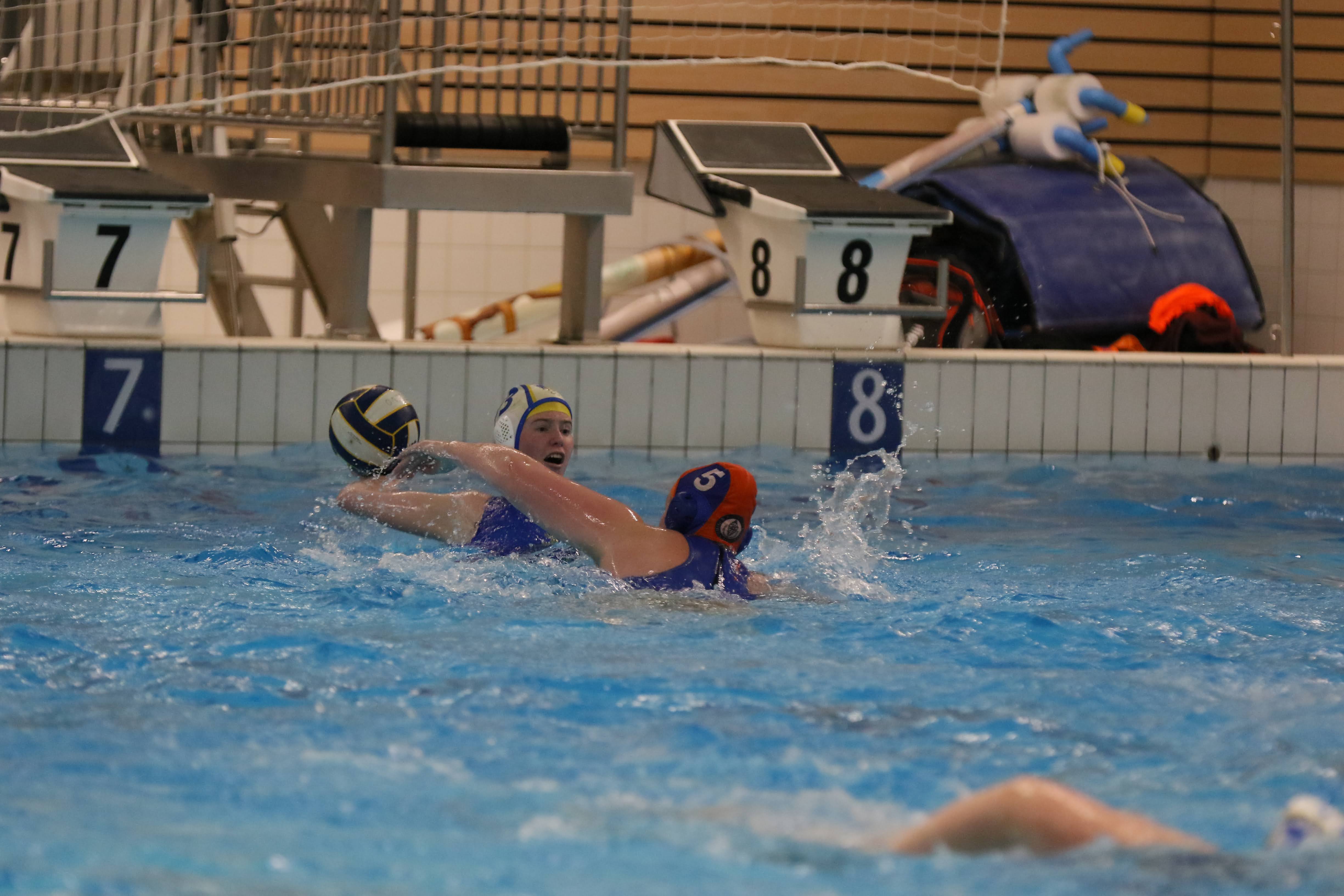 Foto: Lodi SchoonNa aanmoedigende woorden van coach Ronald Bokkers waren de dames erop gebrand het spel recht te trekken in de resterende perioden. Lara van de Vliert legde haar eerste doelpunt van de avond in het doel vanaf de midvoorpositie op aangeven van Jette Bokkers. De veel geoefende man-meer situatie werd goed uitgespeeld door Vera Molan: zij verraste de keepster en scoorde strak in de korte hoek. Hydrofiel kon er in de deze periode slechts 1 goal tegenover zetten, met een bekeken lobje was keepster Nora Doornhof helaas kansloos, de periode eindigde op 4-6.