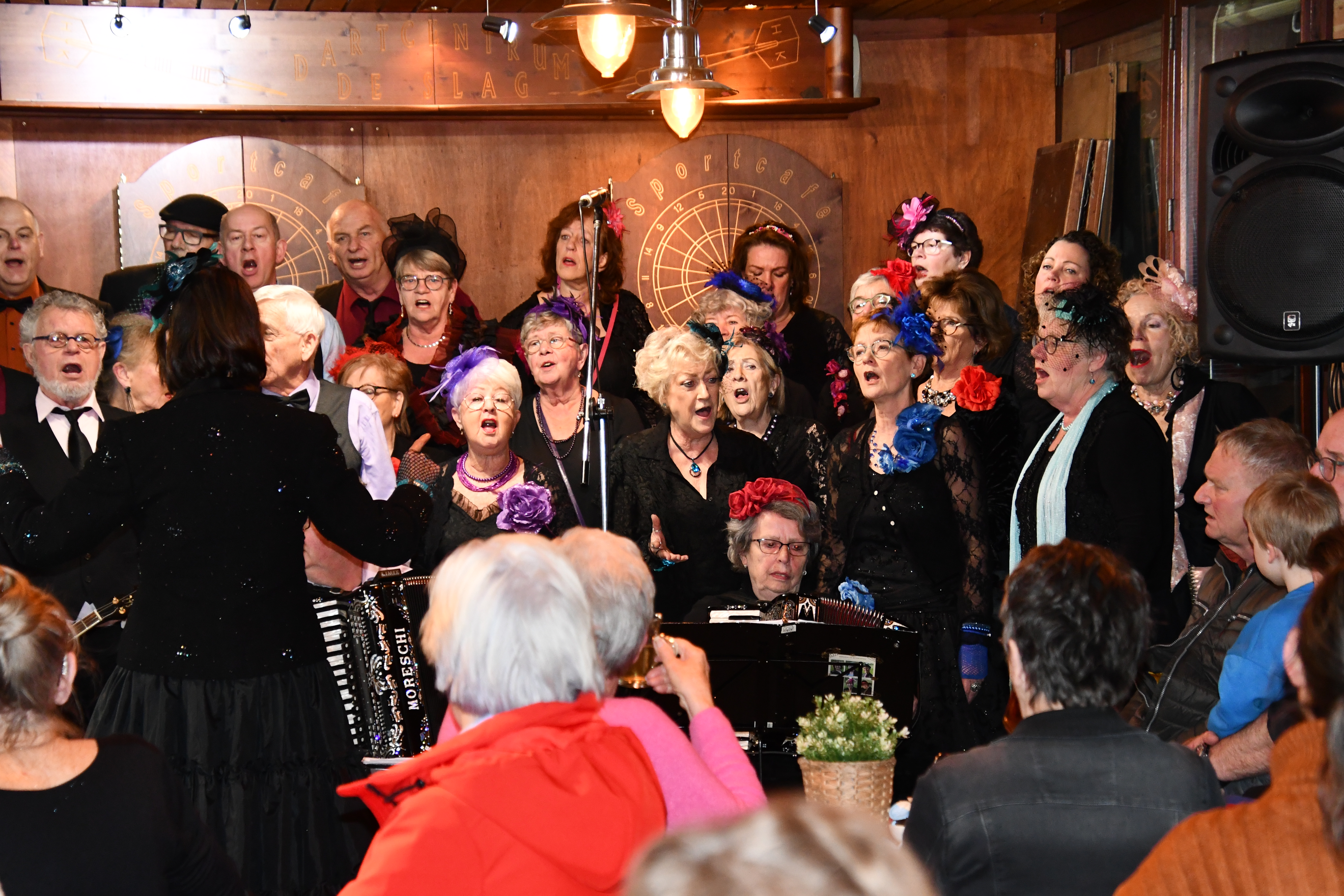 Na een intiem optreden is het een grote overgang naar Sportcafé de Slag, waar het grote smartlappenkoor uit Hoevelaken de ruimte vulde. Het café zat afgeladen vol en zelfs aan de zijkant werden nog extra stoelen bijgeschoven. Een volle zaal kon zo genieten van de meezingers en meedeiners die ten gehore werden gebracht.